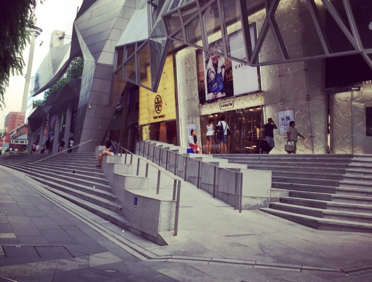 Acessibilidade em Singapura: rampa através da escada, com corrimãos. A escada também tem corrimão. No Brasil, de acordo com a norma ABNT, o corrimão deve ser duplo, com duas alturas. (Foto de Leandro Menna)